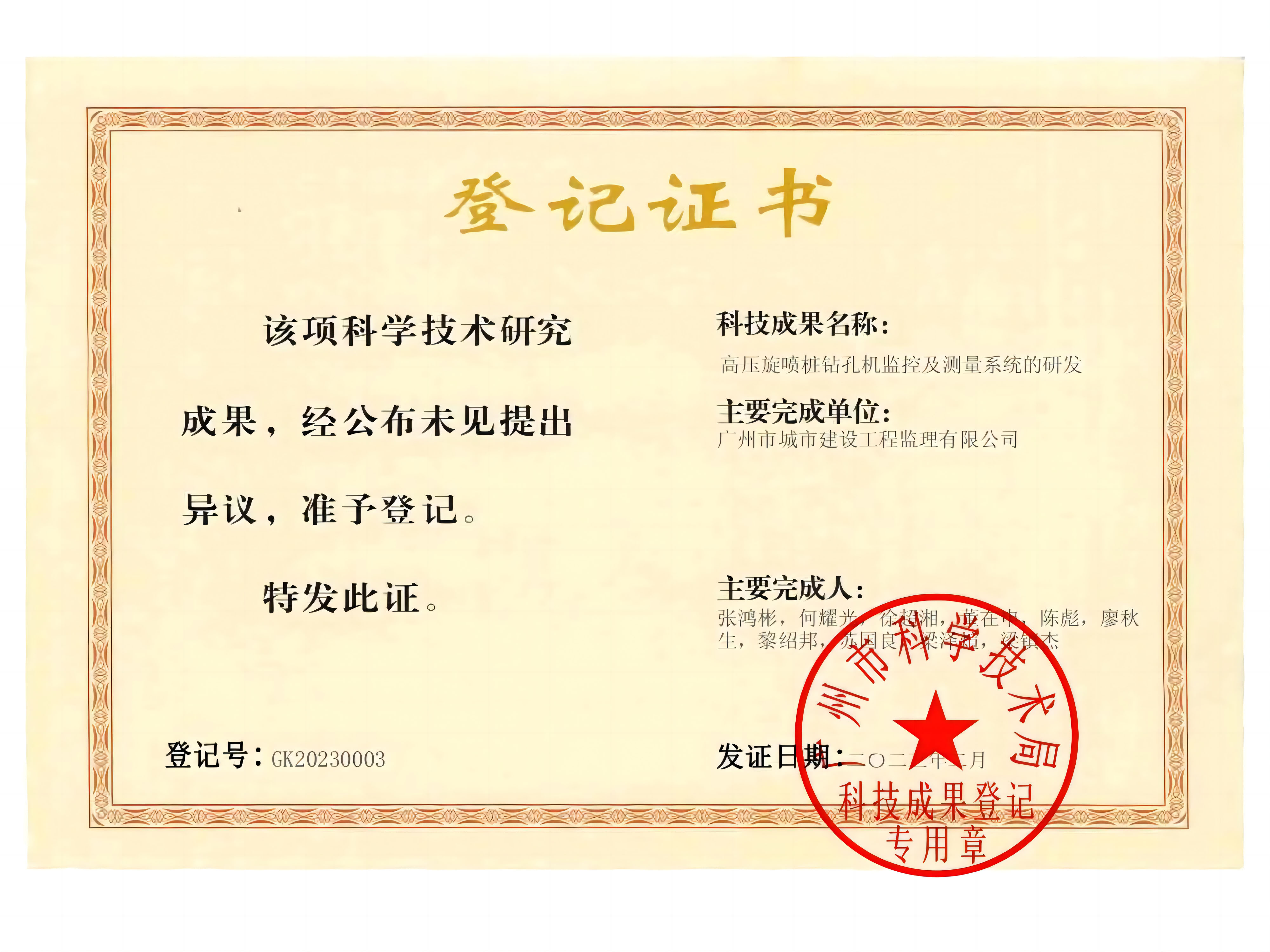 公司科技建设工作再创佳绩!公司2项科研技术:《塔吊运货斗高精度实时监测系统的研发》和《高压旋喷桩钻孔机监控及测量系统的研发》成功通过科技成果登记认证。与此同时,《一种大体积混凝土温差监测报警系统》《一种防漫水门框及防漫水门》和《一种除尘围墙》等5项专利技术经国家知识产权局审批通过授予专利权,取得实用新型专利证书。
